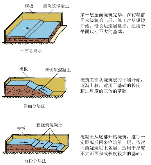 另外,我們在進行分層澆筑時還可視情況采用不同的分層澆筑方式進行: