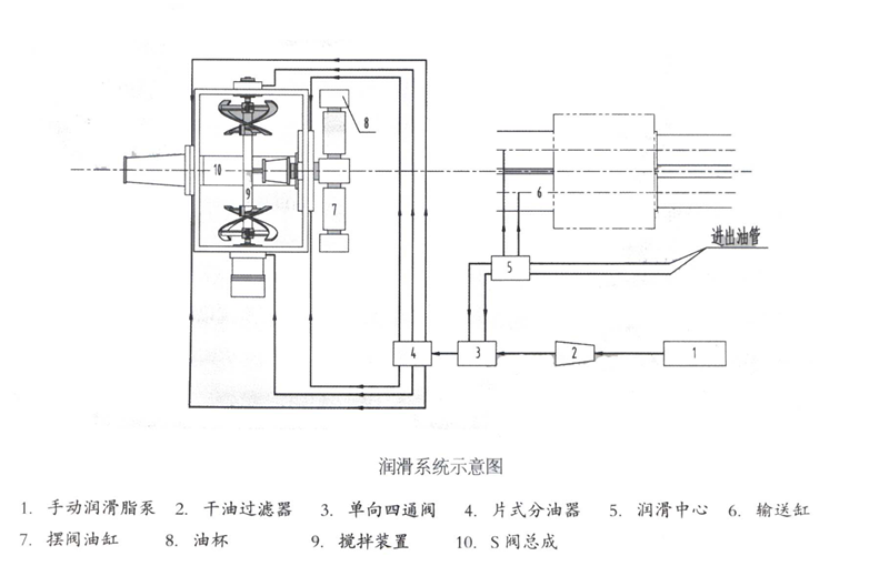 潤(rùn)滑系統(tǒng)由手動(dòng)潤(rùn)滑脂泵、干油過(guò)濾器、單向四通閥、片式分油器、潤(rùn)滑中心和管道組成,如上圖所示。